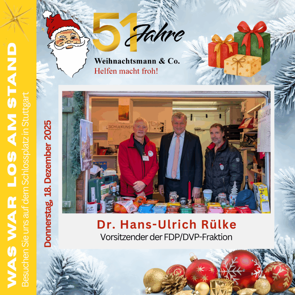 Dr. Hans-Ulrich Rülke, Vorsitzender der FDP/DVP-Fraktion, war am Stand von Weihnachtsmann & Co. im Einsatz und verkaufte persönlich für den guten Zweck. Mit viel Engagement, guter Laune und zahlreichen Autogrammen sorgte er für strahlende Gesichter bei den Besucherinnen und Besuchern.