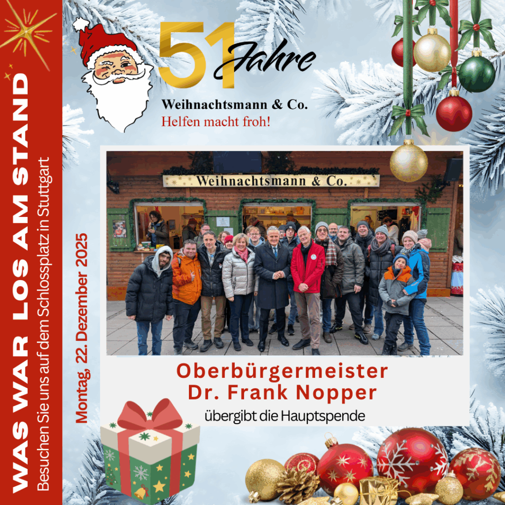 Oberbürgermeister Dr. Frank Nopper hat die Hauptspende an „Weihnachtsmann & Co.“ übergeben. Diese wertvolle Unterstützung kommt dem bhz Stuttgart zugute – konkret dem Klangwasserbett, über das wir bereits in unserem Flyer berichtet haben.